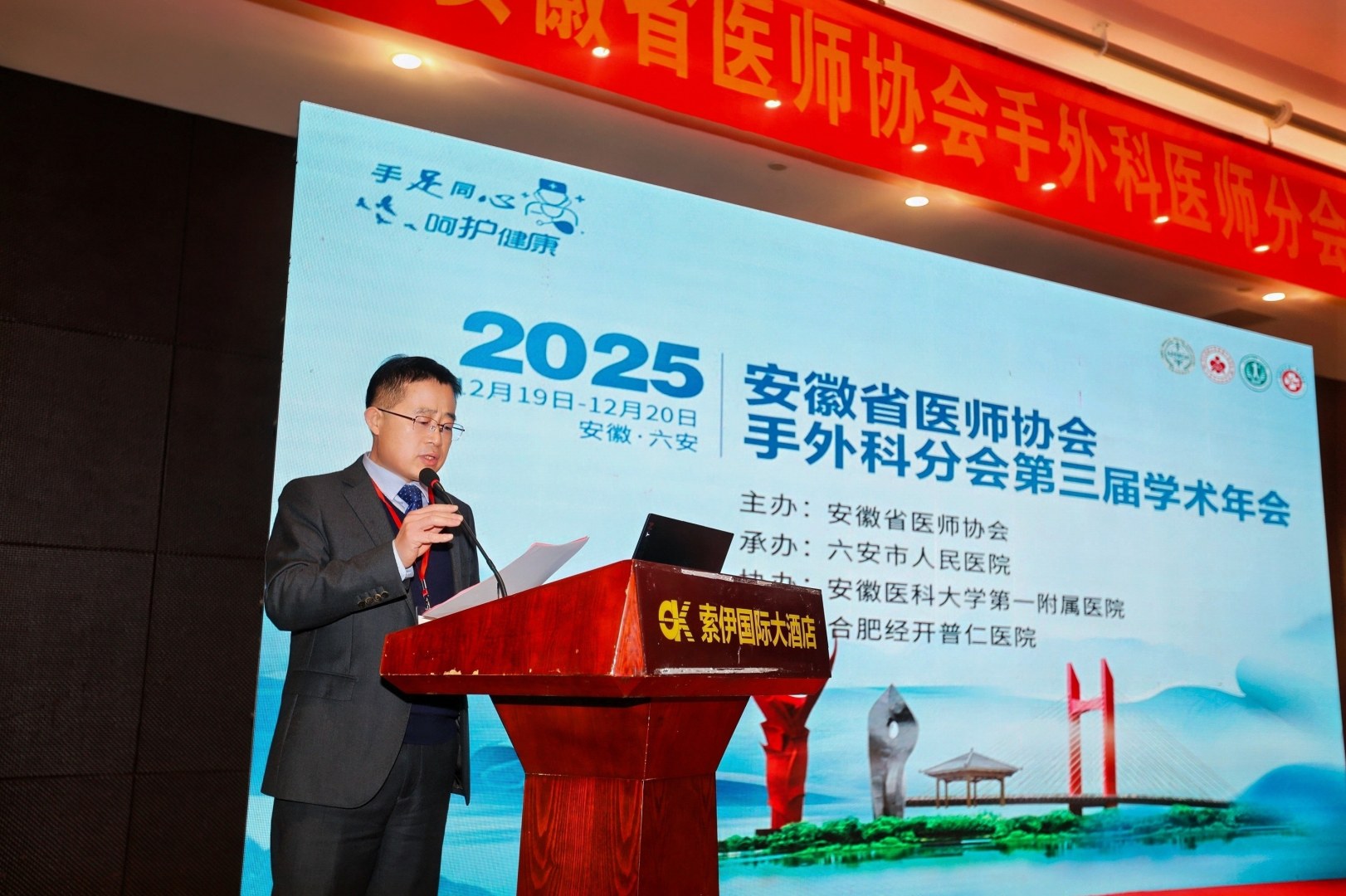 2025年12月19日-20日,由安徽省医师协会手外科医师分会主办、六安市人民医院承办的 “安徽省医师协会手外科医师分会第三次学术年会暨小血管吻合技能比赛及科普大赛”在六安顺利召开。中华医学会显微外科学分会主任委员、中国医师协会显微外科医师分会副会长徐永清教授、中国医师协会手外科医师分会会长、中华医学会手外科学分会名誉主委劳杰教授、安徽省医师协会手外科分会主任委员周洪翔、六安市人民医院院长孙良业参会并致辞,开幕式由六安市人民医院手外科主任杨良军主持。来自全国各地手外科学领域的 300 余名专家学者、临床医师齐聚一堂,围绕学科前沿动态、技术创新突破及临床实践经验展开深度交流,为推动区域手外科事业高质量发展注入强劲动力。